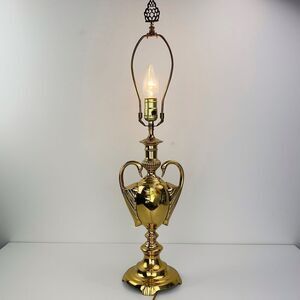 Vintage urn-shaped brass table lamp with swan handles and beautiful shiny polished brass finish.