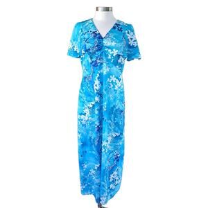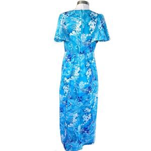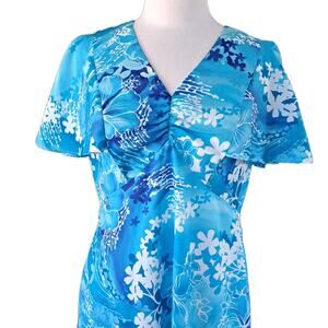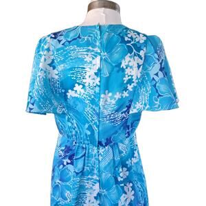 Vintage Holo-Holo Hawaiian Maxi Dress Mumu Turquoise Plumeria Flutter Sleeve