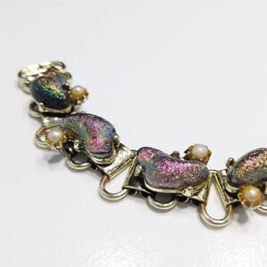 *Description: This is a unique vintage book chain bracelet with holographic glitter glass in irregular shaped cabochons. Each book chain link also has a faux pearl which is prong set. The silver tone metal is bright and shiny and the glitter glass is unique and beautiful. These glass pieces change color as you turn them so sometimes you see magenta, green, blue, etc. I did test the stones to make sure they were glass with the gem tester and they were glass. They are very unique and this bracelet would be a great addition to your vintage jewelry collection.