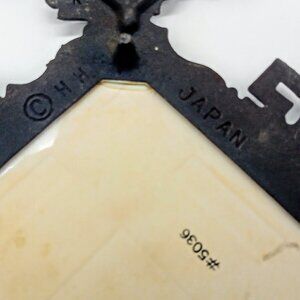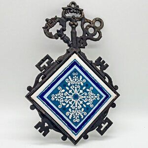 Vintage HH Holt Howard intricate cast iron footed trivet with blue damask pattern tile.