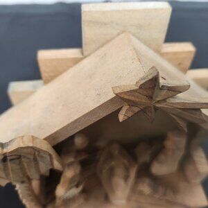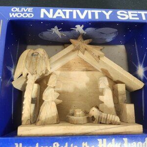Beautiful Vintage olive wood carved Christmas Nativity Scene. Item is handcrafted in the Holy Land out of sacred Olive wood. Piece is still in its original packaging.