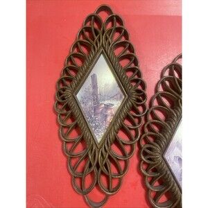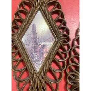 Very cool and in great shape. No cracks or issues beautiful lattice or wicker like frames. These are a nice touch to cottage or home decor. One is a picture of milk pails the other of farm mailboxes.