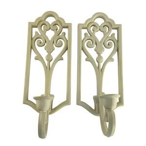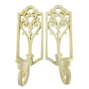 Add a touch of classic 1980s elegance to your home with this gorgeous pair of vintage Homco wall sconces! Dated 1982, these ivory-colored candle holders feature a beautiful open scrollwork design that fits perfectly with Hollywood Regency, Traditional, or even Grandmillennial aesthetics. They're made of durable, lightweight plastic, making them super easy to hang anywhere you need a bit of romantic ambiance.