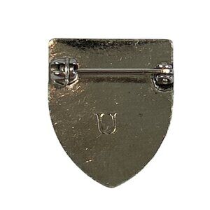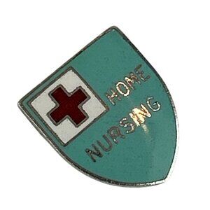 A nostalgic Home Nursing pin badge featuring a shield-shaped design with a red cross and turquoise background - - gorgeous colors! I believe this is from the 1940s.