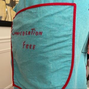 Vintage handmade hand embroidered kitschy cool Turquoise blue apron with red plaid accents. Hand applique and Embroidered with Sayings like one way only, napkins two cents extra, conversation free, and Drop bone here spare the rib. Pat has elastic on the back to fit flexibly. The apron is separating from the red piping trim in a couple of spots but nothing that affects the wear. A couple of spots here or there, See photos for details. Still a lot of fun