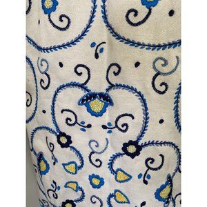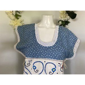 Vintage Homemade Jumper Dress Pinafore Apron 70's Embroidery Calico Farm Cottage. Folk Art Jumper/Dress/ Pinafore/ Apron from the 1970s or 1980's. This is so adorable. One Size Measurements taken: Length: 33". Waist: free. Hips- free. From side to side is : 19". Plus each tie is : 19" extra on each side.