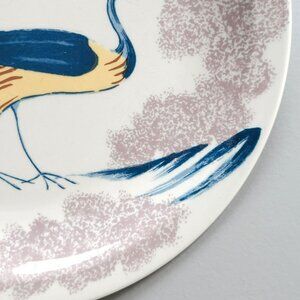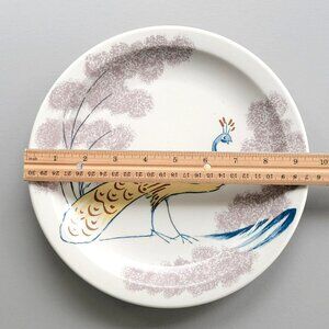 Vintage Homer Laughlin dinner plate featuring a charming design of peacock in blue and yellow and purple leaves. Perfect for collectors or as a unique addition to your dining set. Discontinued restaurant ware, made in the USA.