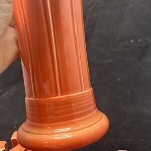 The Vintage Homer Laughlin Red VASE scarlet red HOMER LAUGHLIN FIESTA 9 5/8" MEDIUM NEW Fiesta Persimmons 10" Vase decorative pottery pieces originating from Newell, West Virginia. Created by the Homer Laughlin brand in the 1930s to 1940s, these items feature the iconic Fiesta pattern in the persimmons red color. Handmade and kiln-fired, these pieces showcase a deco style with a glazed finish, making them a unique and collectible addition to any home decor. Made in the United States and weighing 2 lbs 3 oz, these items are a charming representation of mid-20th-century American pottery craftsmanship.