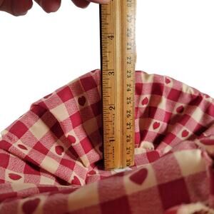 Charming Homespun Creations wicker basket with a red and white checkered liner adorned with heart patterns. Ideal for adding a touch of country décor to your home. Perfect for display, not intended for food use.