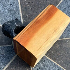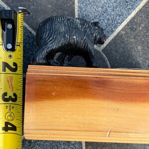 The bear is painted black metal on a wood block. This dates back to the 1950s or 1960s.