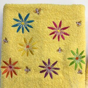 Lovely yellow terry cloth towel with colorful honeybee & flower embroidery