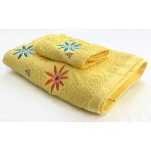 Vintage Honeybee & Flower Embroidered Towel Set 2 Pc Washcloth & Bath Yellow Bee