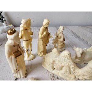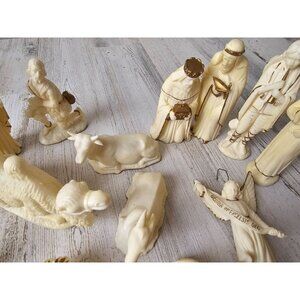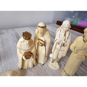 All the people are about 5-in tall, camel is about 3 in by 5.5, Jesus is 1.5 by 2.5x2 in, overall moderate wear, overall sold as a set, does have multiplayers of decolorization scratches and wear on items, sold as a set