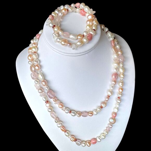 Vintage Honora 40" Pearl & Gemstone Necklace & Bracelet Set Pink Rhodochrosite