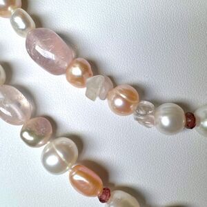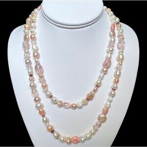 Vintage freshwater pearl and gemstone necklace by Honora. Features iridescent ivory pink and blush pearls, Rhodochrosite, gemmy Rose Quartz and tiny red glass rondelle beads. 40 long for layering. Sterling Silver clasps. There are two pairs of matching stretch bracelets. Perfect for any occasion. Comes with a Honora pouch.