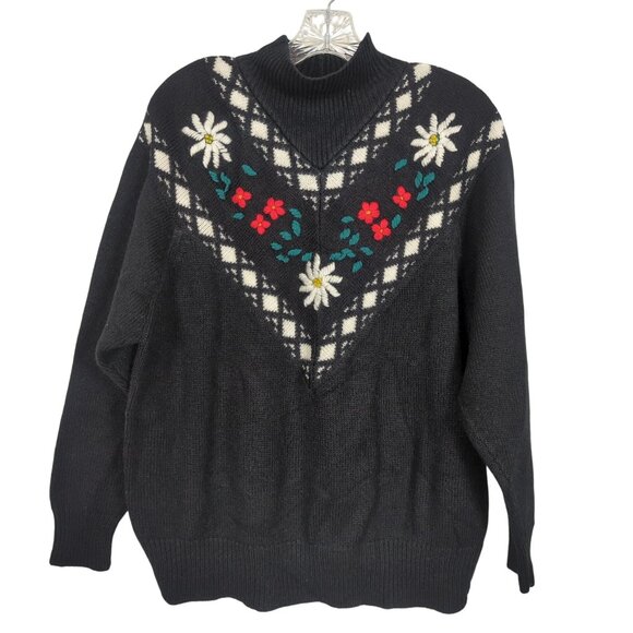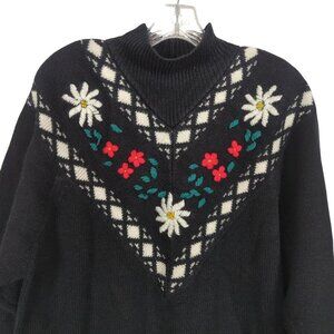 Vintage Honors Misses Sweater Women’s L Black White Floral Embroidered Argyle