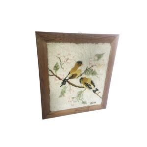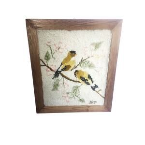 Vintage Hook Loop 2 Birds on a Branch Rug Piece Wood Frame Wall Hanging