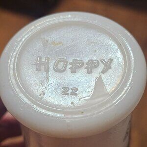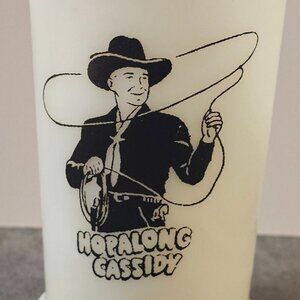 A delightful piece of Americana, this vintage milk glass tumbler features Hopalong Cassidy. A charming collectible for Western enthusiasts or nostalgic kitchenware.