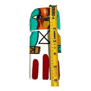 This handcrafted Native American Kachina Doll stands 7.5 inches tall. Made from painted wood, it features vibrant colors and traditional ethnic designs.