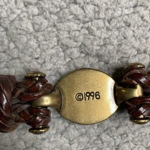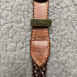* Leather shows general surface wear and light creasing, especially around the buckle holes. Brass-tone hardware has mild scratching and tarnish from normal use but remains structurally solid. Braided sections and stitching are intact with no breaks or loose areas.