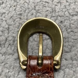 * Details: Decorative western buckle and keeper with etched design, oval center concho featuring raised horse head, multiple adjustment holes, style code stamped on leather: 93207. Hardware on buckle and concho stamped ©1996, indicating 1990s era production.