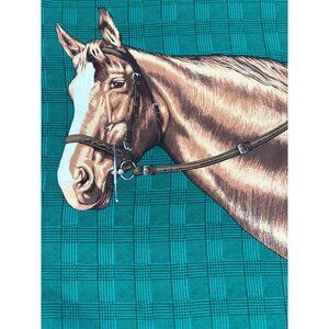This vintage silk scarf showcases an equestrian theme with an intricate horse print and plaid background. Its soft material and elegant design evoke timeless sophistication, making it a collectible or wearable piece reminiscent of classic countryside charm.