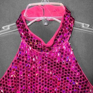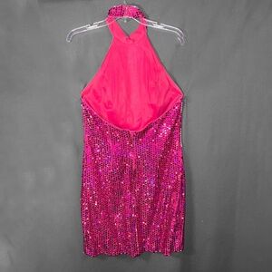 - Hot Pink, High Front Halter Stretch Mini Dress Covered with Square Iridescent Pink Sequins