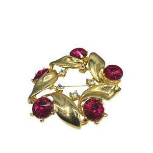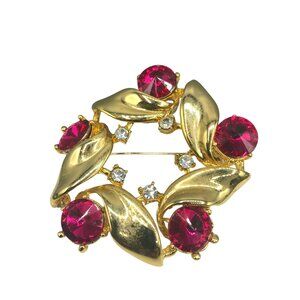Vintage Hot Pink Rivoli Crystal Wreath Brooch, Stunning Gold Tone with Clear
