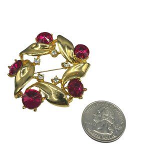 Vintage Hot Pink Rivoli Crystal Wreath Brooch, Stunning Gold Tone with Clear Crystal Accents, Stylish Pin