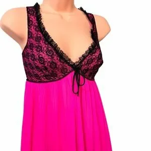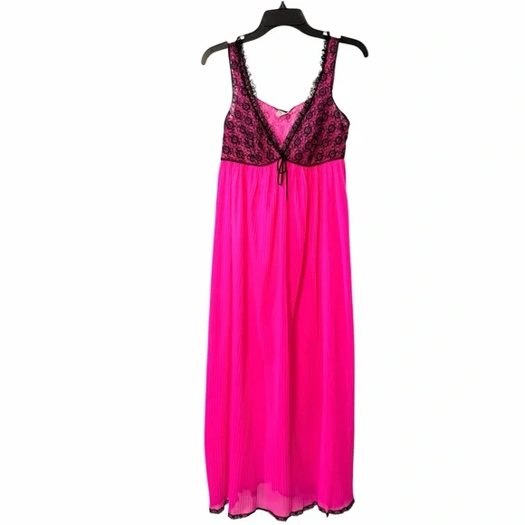 Rare and oh soooooo FABULOUS hot pink pleated flowing and black lace vintage nightgown! 😍 Union made and in great preowned condition. Previous owner took very good care of it. Size medium on tag. See measurements: