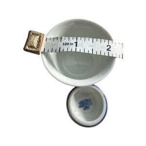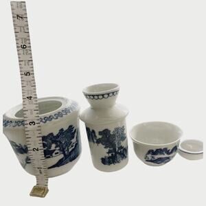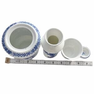 Excellent preowned condition sake set has four beautiful pieces of China. First there is the base which is approximately 3 1/2 inches tall and 3 1/2 inches in diameter. Next is the sake holder which is approximately 3 3/4 inches tall and approximately one and 3/4 inches in diameter with a one and a half inch opening at the top. This piece fits perfectly into the larger vessel. Next is the cup, which is one and a quarter inches deep and approximately 2 1/4 inches in diameter. This piece fits over top of the inner vessel. Lastly is a tiny cap or some kind of container which measures one and a quarter inches in diameter and a half inch tall. It can sit on top of the other three pieces. This is a great conversation piece to add to your decor, but it’s also very convenient for tea or sake. Three of the bases are signed.
