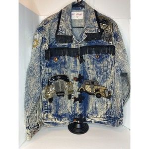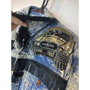 Get ready to make a statement with this vintage acid wash jean jacket! This hot stuff features retro sequin details and rhinestone buttons that will catch everyone's eye. The jacket is a size small and has a regular fit, perfect for any occasion whether it's travel, party/cocktail, or casual wear.