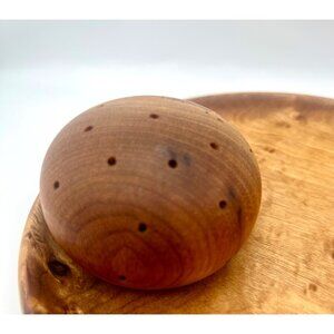This Myrtlewood serving dish tells of the Oregon coast's beauty, where artisans transform nature into functional art. Its rich grain and warm tones cradle appetizers or cheese with timeless elegance, while the toothpick holder adds practicality and charm to every gathering. A Mid-Century Modern piece to admire and use.