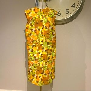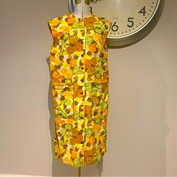 Cute cotton floral house dress with embroidered detail on pockets. Please note some light marks around collar area but does blend with fabric as well as what looks a fabric flaw on left bust, see last two images.