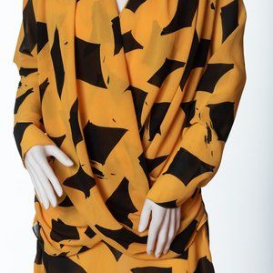 This listing is for a vintage dress by How Sweet It Is. This vintage marigold yellow and black dress has a great graphic pattern all over the dress. The dress has long sleeves, a zipper closure in the back and shoulder pads.