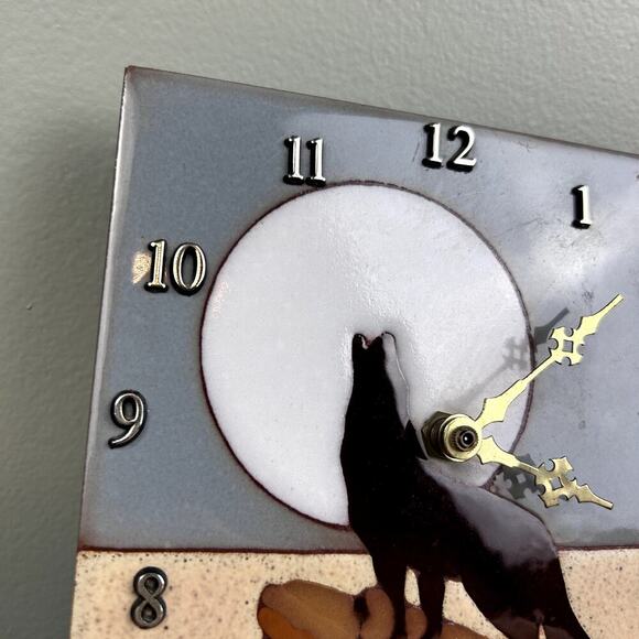 Super cool glazed ceramic tile howling wolf/coyote clock. No manufacturer's marks.