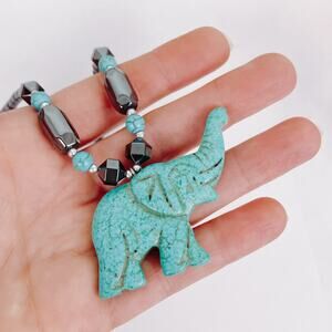 An elephant pendant carved from turquoise-hued howlite brings a sense of calm strength and earthy charm. Accented by glossy hematite beads, it balances grounded energy with a touch of shimmer, creating a piece that feels timeless and meaningful.