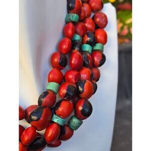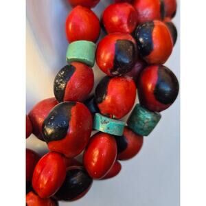 This is a truly remarkable piece of jewelry. 4 separate strands of vibrant red and black Huaryruro Seeds, also known as, Wayruru and Aymara seeds which come from the Ormosia Coccinea plant that grows in South America.