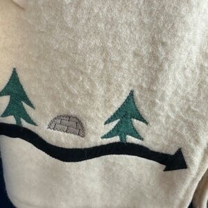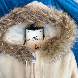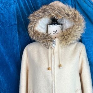 Vintage Hudson Bay Inuit Wool Parka. It is cream colored with fur (not sure what kind) trim. There is also leather trim around the sleeves. There is an inside zippered pocket in addition to two outside pockets. Parka is in excellent condition with no stains or moth bites.
