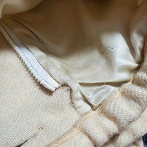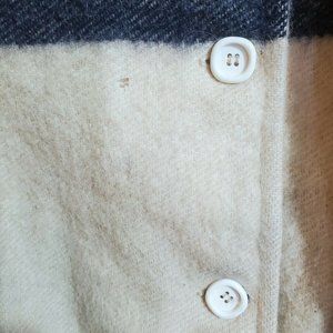 There are two small holes in the wool on the front of the jacket. They are located to the left of the 3rd and 4th buttons. Under the black stripe.