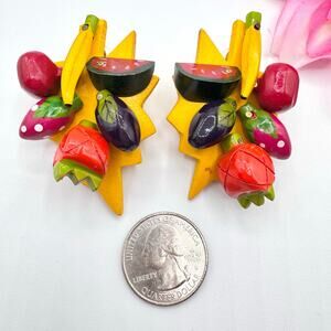 Vintage Huge Fruit Salad Earrings Hand Painted Wood Kitschy Funny Gaudy Wacky