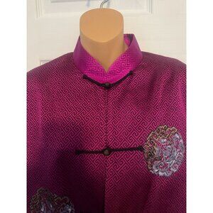 Beautiful mandarin jacket in a magenta purple color with intricate embroidered details. This is a thick lined jacket with pockets, it also has shoulder pads. There is no size noted. Based on measurements it is estimated to fit size L/XL in womens.