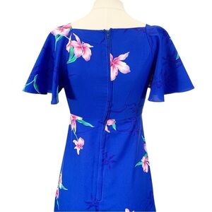 Features: Synthetic blend fabric in blue all over floral print. Round neckline. Flutter short sleeves. Maxi length. Back zip closure.