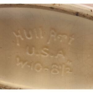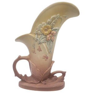 This vintage Hull Art Pottery Cornucopia Wild Flower Vase from 1947 is a charming piece of decorative pottery with a Wild Flower pattern. Made in the USA in the Arts & Crafts/Mission Style, it features a matte finish and a 3D effect. The vase stands at 9-1/2 inches tall and 8-1/2 inches wide, with a multicolor palette that adds a touch of whimsy to any space. With its original production style and era, this Hull vase is a unique and handcrafted addition to any collection of mid 20th-century pottery.