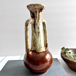 Cool little vase features 2 handles, a two-tone brown drip glaze, and a modern shape. The number 100 is impressed on the bottom. This is in very good condition, please refer to images and thanks for looking!