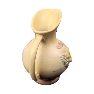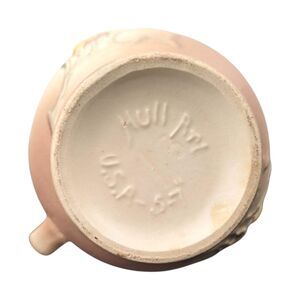 This lovely vintage Hull pottery pitcher features a beautiful magnolia blossom design in shades of yellow, pink, and green. Crafted in the classic Art Deco style, this piece is both elegant and functional.