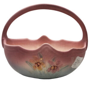 The Vintage Hull Pottery USA Pink Iris Floral Basket # 408-7 is an antique decorative piece that showcases a beautiful multicolor floral pattern. Crafted from pottery in the 1930s in the United States, this art pottery item features an incised backstamp and measures 8" in length, 7" in height, and 7" in diameter. The vintage basket from the Hull Pottery product line adds a touch of elegance to any space with its unique design and theme of flowers.