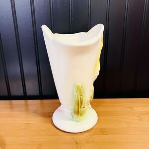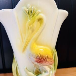 This vintage Hull Pottery Flamingo Heron Crane Hibiscus vase is a beautiful addition to any collection. The yellow and green colors of the vase perfectly complement the bird theme, making it a great decoration for any room. The vase is made of ceramic and has a production style of art pottery.