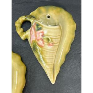 Vintage Hull Wall Pockets Pair Set Woodland Floral Green Pink 1940s Conch Shell