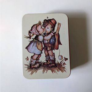 Vintage stationary tin with note paper inside. There is a Hummel like sweet image of Dutch girl kissing Dutch boy on the front.
